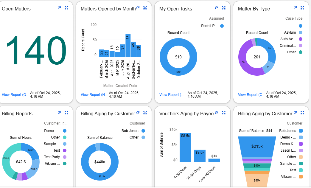 Custom dashboards and reports help you track finances, profitability, trust balances, and firm performance in real time.